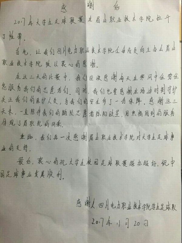 参赛球员在信中这样写到:“在这三天的比赛中,我们应该感谢每天在寒风中任劳任怨服务我们的志愿者们。同时,我们也要感谢在场边随时守护关注我们的医护人员,为我们的安全多了一份保障。在此,我们真心感谢眉山职业技术学院对大学生足球事业的支持。”