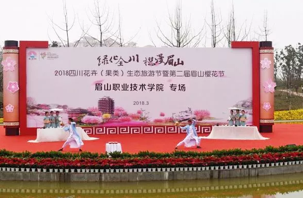 2018四川花卉(果类)生态旅游节暨第二届眉山樱花节在眉山市樱花博览园隆重开幕,3月17日,眉山职业技术学院大学生艺术团80余名师生齐聚樱花博览园南湖剧场,举办了“第二届眉山樱花节眉山职业技术学院专场文艺演出”,为园内6000余名游客奉上了一场精妙绝伦的视听盛宴。