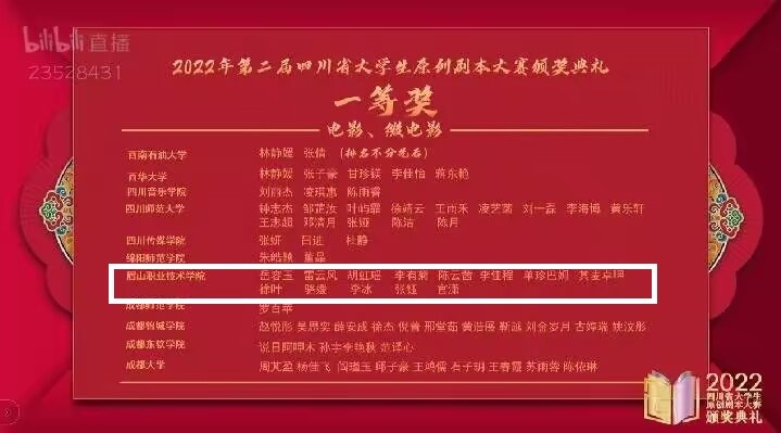 本次大赛面向四川省高校正式注册的在校学生(专科生、本科生、研究生)举办,根据“电影剧本(含微电影)”、“舞台剧剧本”和“剧本杀剧本”单元分设奖项,并按总投稿数量的10%、20%、30%设置一、二、三等奖。我校共15部作品参赛,获奖12项,其中一等奖7项,三等奖5项,获奖比例达到80%。中文教研室李涛、万敏、蒋静、周彩虹获优秀指导教师称号。在本专科同赛道比赛中,我校是全省唯一 一所获得一等奖的高职院校。