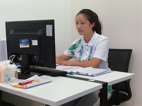 除了负责中场节目表演事宜外,袁娇还负责场馆的颁奖仪式。颁奖仪式的实战彩排是从场馆开赛第一天开始,每天晚上的赛事结束后,颁奖彩排才能进行,为的就是对标决赛时的时间节点。一轮彩排实地演练颁奖流程、赛时工作点位,再与主管、同伴复盘和纠正,她常常要在晚上23点后才能回到寝室。正是这样的认真,确保了赛时颁奖仪式的高效、精彩、零失误。