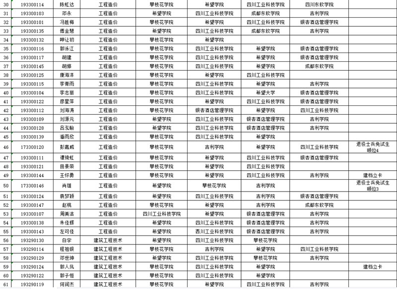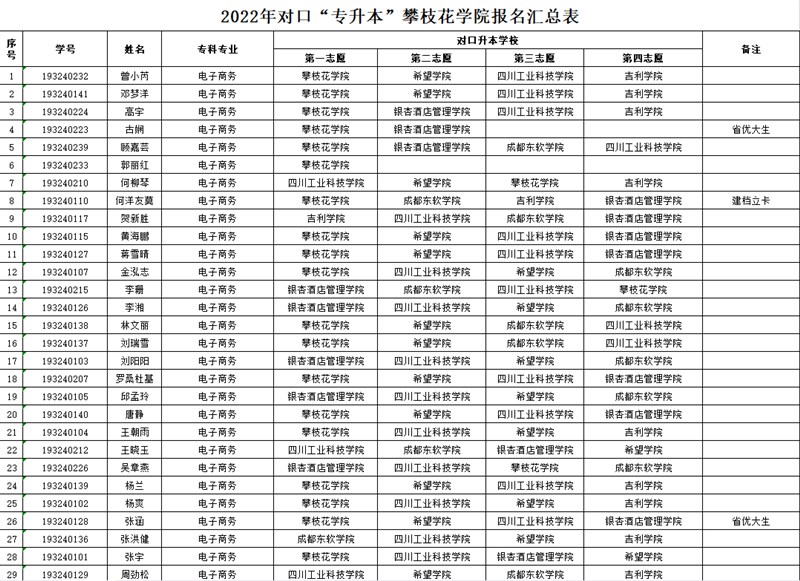 根据《四川省教育厅 四川省退役军人事务厅 四川省人民政府征兵办公室关于做好2022年普通高等学校专升本考试招生工作的通知》(川教函〔2022〕100号)、《四川省教育考试院关于做好我省2022年普通高等学校专升本考试报名和考试工作的通知》(川教考院函〔2022〕6号)和《2022年攀枝花学院及调剂学校专升本联合招生简章》文件精神,学校专升本办公室按文件要求组织开展2022届毕业生专升本报名工作。现将经我校初审通过的“专升本”报名学生予以公示,公示时间2022年3月9日-3月15日(五个工作日)。