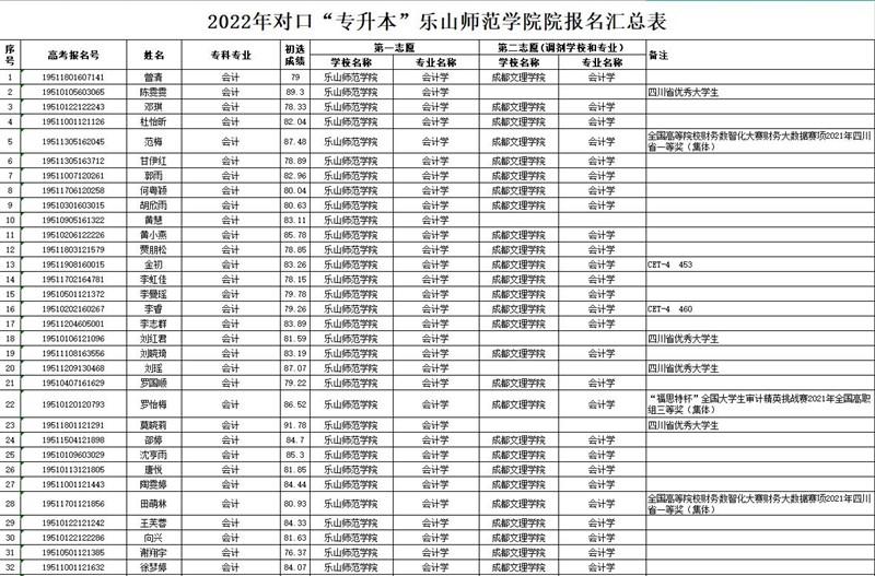 根据《四川省教育厅 四川省退役军人事务厅 四川省人民政府征兵办公室关于做好2022年普通高等学校专升本考试招生工作的通知》(川教函〔2022〕100号)、《四川省教育考试院关于做好我省2022年普通高等学校专升本考试报名和考试工作的通知》(川教考院函〔2022〕6号)和《乐山师范学院2022年“专升本”招生简章》文件精神,学校专升本办公室按文件要求组织开展2022届毕业生专升本报名工作。现将经我校初审通过的“专升本”报名学生予以公示,公示时间2022年3月9日-3月15日(五个工作日)。