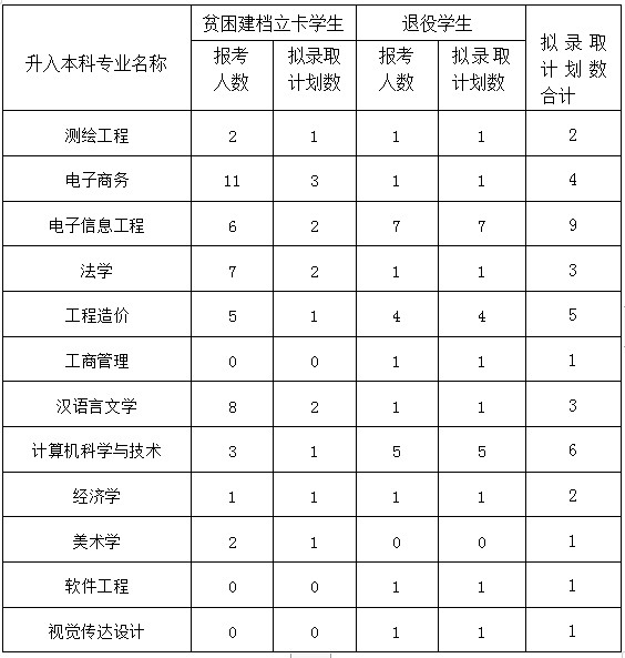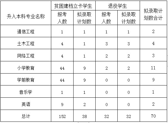 按照《关于做好 2022 年普通高等学校专升本考试招生工作的通知》(川教函[2022]100 号)要求,内江师范学院根据建档立卡贫困学生、退役士兵报名参加我校专升本考试人数,分专业编制了专项录取计划,并公示如下: