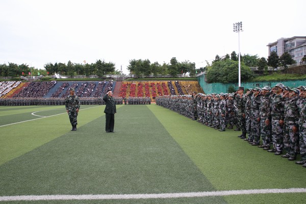 9月20日,学校2019级新生军训总结大会在学校运动场举行。学校党委副书记、院长徐井万,武警眉山支队执勤一大队教导员刘伟出席大会并检阅各方队,学校在校校领导、各中层管理人员及承训单位领导出席大会。会议由党委委员、副院长胡洪安主持。