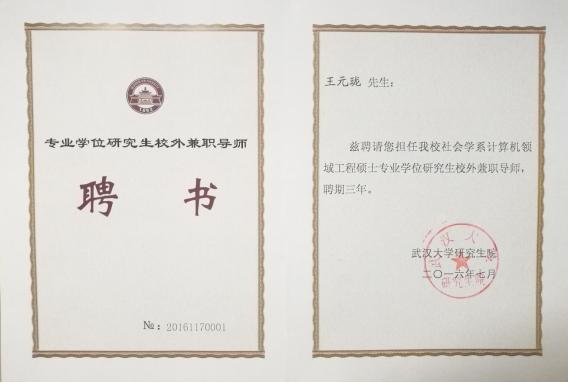 王元珑担任武汉大学专业学位研究生校外兼职导师