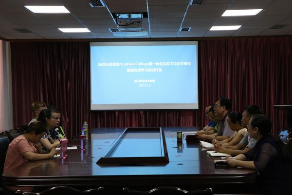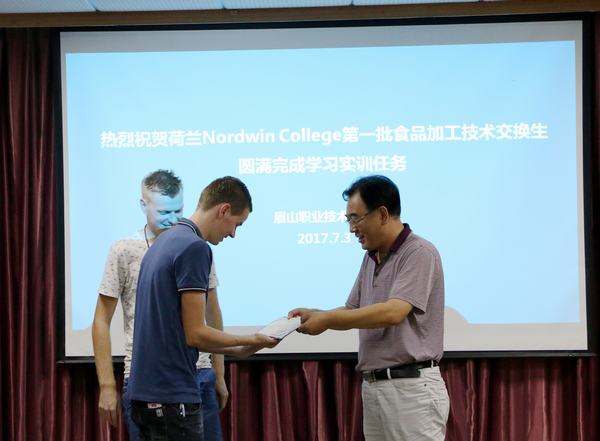 7月3日下午,眉山职业技术学院在行政楼一楼会议室举行祝贺荷兰Nordwin College食品加工技术交换生圆满完成学习实训任务欢送会。学院副院长张望、教务处处长罗树明、文化艺术系主任刘桦、科技合作处副处长刘聃、农业技术系主任杨加琼、学生处保卫科科长孙亮、留学生任课教师参加了会议。