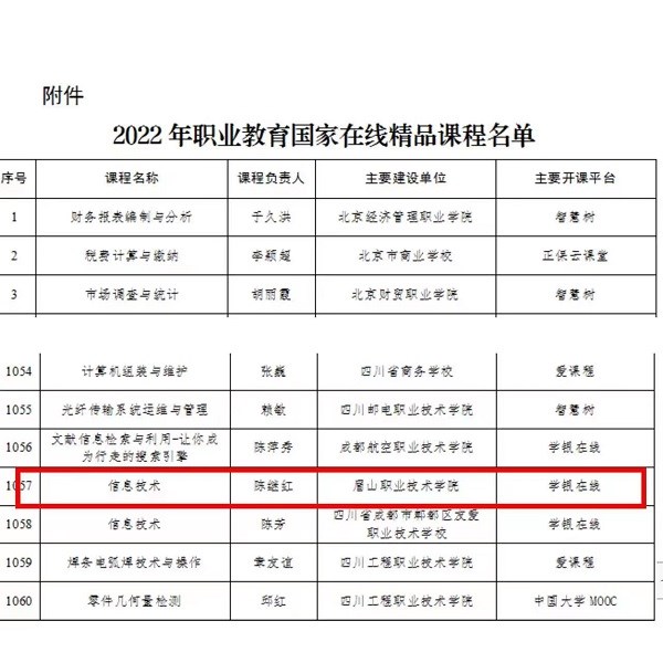 近日,教育部办公厅公布2022年职业教育国家在线精品课程认定名单。我校中等职业教育部《信息技术》课程入选教育部2022年职业教育国家在线精品课程名单。