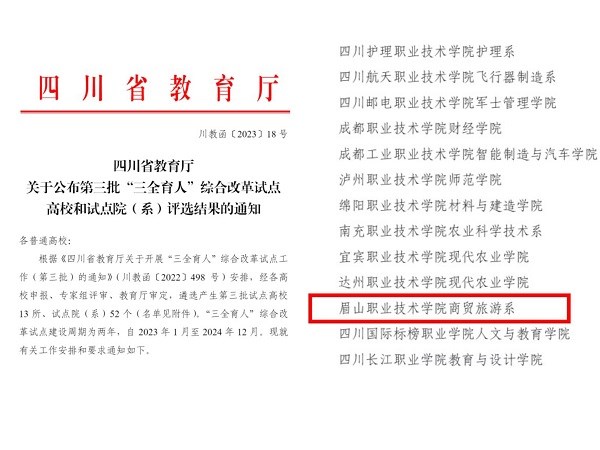 1月12日,四川省教育厅公布第三批“三全育人”综合改革试点高校和试点院系评选结果,我校商贸旅游系成功获批四川省第三批“三全育人”综合试点改革院系。