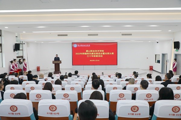 为进一步加强学校师德师风建设,促进广大教师坚定理想信念、厚植爱国情怀、涵养高尚师德,争做“四有”好老师。11月3日,学校在招生就业服务中心二楼多功能厅举行师德师风建设推进会暨光荣从教30年致敬活动。党委书记代贤军出席会议。党委委员、工会主席彭书君主持会议。