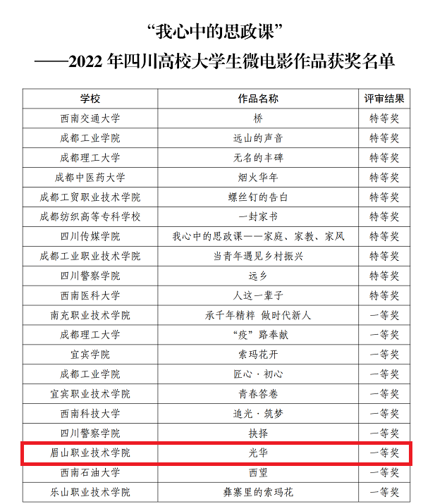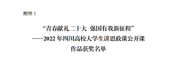 11月9日,由四川省委教育工委主办的2022年习近平新时代中国特色社会主义思想大学习领航计划主题教育活动落下帷幕。我校马克思主义学院精心打磨的5部参赛作品,大学生讲思政课公开课作品《以青春之我:传承文明,开拓创新》获特等奖、《追随总书记的脚步,让青春在乡村振兴中绽放》获一等奖、《故里寻踪读东坡,青春远航守初心》获二等奖;“我心中的思政课”微电影作品《光华》和《东坡味道》均获一等奖。同时,学校获优秀组织高校奖。