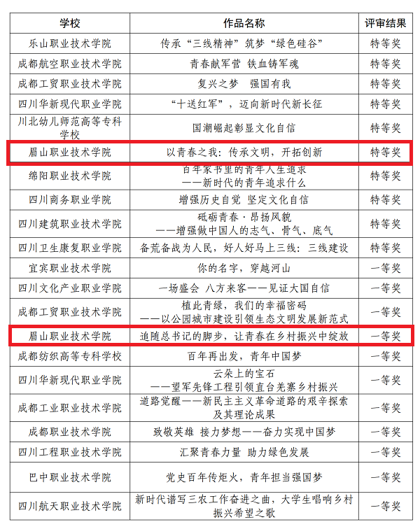 本次活动历时5个月,全省100余所本专科院校共提交400余件作品参评,评出大学生讲思政课公开课特等奖20个、一等奖40个、二等奖60个,评出“我心中的思政课”微电影特等奖10个、一等奖20个、二等奖30个,优秀作品将在四川智慧教育平台进行展示。