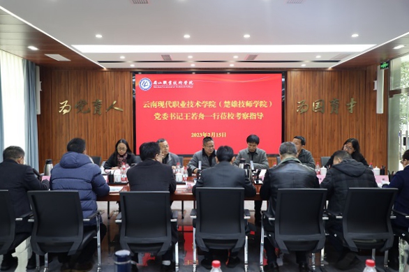2月15日,云南现代职业技术学院党委书记王若舟一行8人来校考察交流。学校党委书记代贤军出席考察调研。