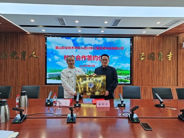 3月29日,学校与四川李记酱菜调味品有限公司在行政楼一楼会议室举行了校企合作签约仪式。学校党委副书记、校长徐井万为四川李记酱菜调味品有限公司授“眉山职业技术学院教师企业实践流动站”“眉山职业技术学院实践教学基地”牌。