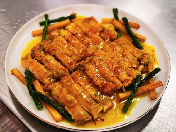一边理论教学,一边实践指导。对于长期从事烹饪的胡桃生而言,整个现场烹饪过程生动详细。如每个食材的处理方法,注意事项,学生最容易忽视的问题,他都明确指出并说明要点,为学生们上了一堂高水平的烹饪技艺课。选料、加工、烹调、装盘……整个过程持续2个小时,一盘色泽明亮,浸满浓香汁液的藏红花扒鸡就制作完成,在灯光下泛出点点的油光,扑鼻的香味阵阵袭来,惹得现场学生连连称赞。