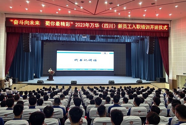 刘聁果代表公司对494名新员工加入万华(四川)表示热烈欢迎,并详细介绍了企业发展情况,分享了企业优秀员工故事,鼓励新员工在以后的工作中要敢于拼搏、直面挑战、不屈不挠;要主动学习,勇于创新,练好本事,打好基础,与企业共发展、共成长。