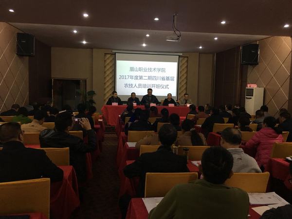 10月24日,眉山职业技术学院2017年度第二期省级基层农技人员知识更新培训班在眉山市滨江花园酒店开班。学院副院长张望、科技合作处副处长刘聃、农业技术系主任杨加琼、党总支书记赵建聪、党政办主任李尧以及来自宜宾市和内江市9个区县的92名基层农技人员参加了开班仪式。仪式由赵建聪主持。